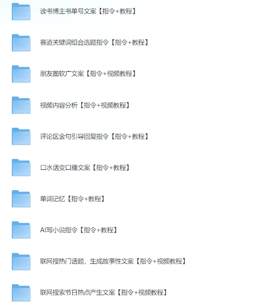 最新AI指令合集,一份高质量Ai指令,解决你的内容创作【指令+教程】(纯净版),涵盖从短视频脚本、广告文案、公文写作到AI生成PPT、小说、散文等多种类型。还包含热点文案生成、评论区互动、情绪化标题、文案排版等优化工具。无论是内容创作者、品牌运营者,还是学习者,都能借助这些指令高效提升写作质量和创作效率,夸克网盘资源。