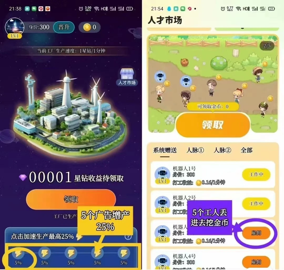 2⃣ 点击人才市场,雇佣5个工人