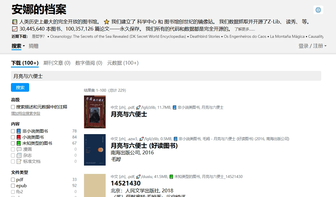 在Z-Library电子图书馆无法正常使用后,也出来了一大堆的Z-Library电子书镜像和电子书搜索引擎,得益于Z-Library BT磁力数据库,而这个Anna’s Archive,就是一个新出的Z-Library电子书搜索引擎,电子图书全部来源于Z-Library 和Library Genesis forks,是Z-Library图书馆镜像的备份,可以搜索书籍、论文、漫画、杂志和其他文件,不过目前好像暂不支持中文搜索,可以通过电子书标题、作者、ISBN、MD5等等进行搜索,不过是英文搜索,还可以通过种子批量下载电子书数据库。