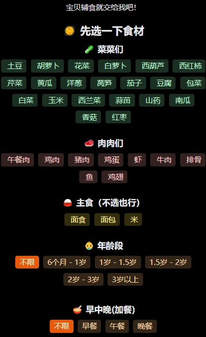 今天吃什么?一款免费的在线宝贝辅食工具可以帮助你解决这个烦恼,宝贝辅食就交给这款在线工具吧,非常简单实用,只需要选出食材原料、年龄段,工具即可在线组合出各种菜式,点击菜式即可跳转到抖音短视频进行教学制作,即使小白也能很好的使用,非常实用的宝贝辅食工具。