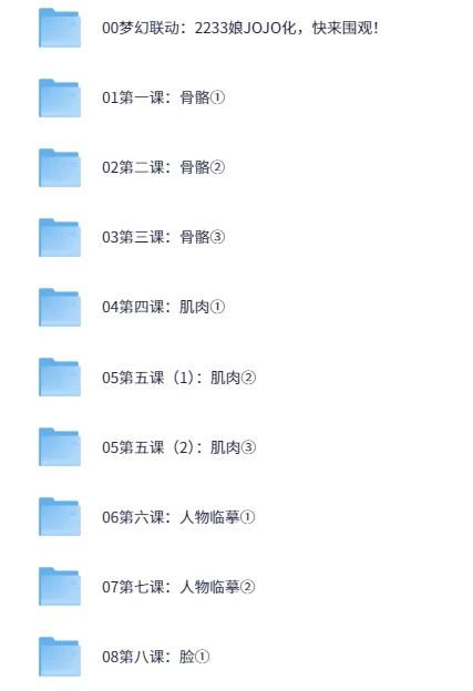 代代木动画学院推出的零基础绘画课程(角色篇)共含15节内容,覆盖角色解剖到细节刻画的全流程。开篇呈现梦幻联动——2233娘以JOJO风格再现,帮助学员体验风格化创作。后续课程围绕人体结构与表现技法展开,循序引导学员从骨骼认知到肌肉刻画,进而掌握人物临摹与面部、头发、手脚等部位的精细处理。