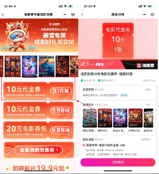 微信打开活动->直接0.1亓买10亓电影票券,所有电影都是通用的!