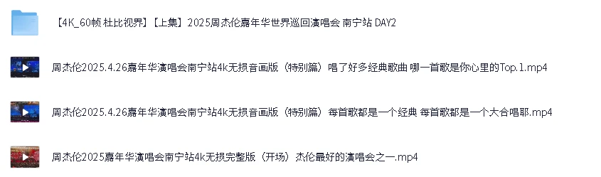 周杰伦2025 0426嘉年华演唱会南宁站4K无损音画版,收录了周杰伦2025“嘉年华”世界巡回演唱会南宁站(2025年4月26日)Day2的高品质画面与无损音频。分为上、下集两部分,上集以4K 60帧杜比视界格式呈现演出前半段,细腻还原舞台灯光与嘉宾互动;下集则继续展示下半程曲目,配合无损音轨让现场氛围更具临场感,夸克网盘资源。