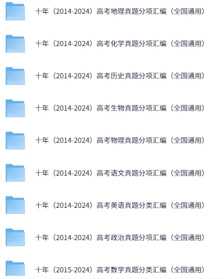 《十年高考真题》全科分类汇编(2014-2024),夸克网盘课程。这套《十年高考真题全科分类汇编》汇集了2014年至2024年全国通用的化学、历史、地理、政治、物理、生物、英语和语文八大学科真题分项整理,同时收录了2015年至2024年高考数学真题分类汇编,覆盖各科核心考点与题型。每个分册均按知识模块和题型特点精细归纳,方便考生针对弱项进行专项练习,实现知识结构的系统梳理与能力提升,为高效复习提供全面支持。
