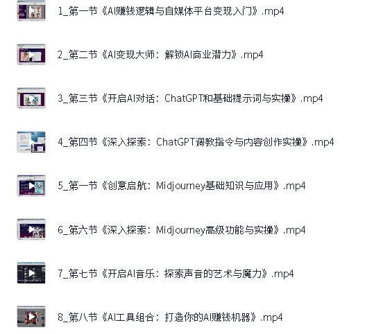 AI全域变现实战营,手把手带你赚到副业第1桶金,夸克网盘课程。是一套系统化的AI商业应用课程,通过30个实战单元覆盖主流平台变现策略。从ChatGPT提示词调教到Midjourney视觉创作,详细拆解AI工具在内容生产中的核心技巧,包含短视频标题批量生成、二创混剪技术、公众号爆文写作等实用场景。