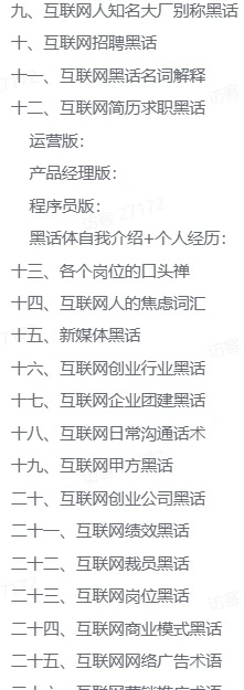 网友总结的一份互联网最全黑话词典 2024版,是目前最全的互联网黑话词典,收录词条超过5000条,超3.5万字,共34个章节,还会持续更新的。 黑话词典的意义更多在于解读官话、套话,用人话说心里话,当然也可以让互联网小白快速掌握专用词汇和爱用黑话的朋友对吹。也是最好的互联网科普读物,帮助大家在职场生存,求职面试等过程中更能运筹帷幄。