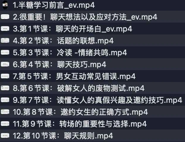 牵手丘比特推出的《半糖课程学习》由十一段视频组成,围绕从心态准备到实际邀约的全流程展开。课程兼顾理论与实战,帮助学员在与异性交谈时既保持自然真诚,又能巧妙引导对方情绪,提高互动质量。课程内容环环相扣,覆盖从心态准备到邀约落地的各个步骤,适合希望提升异性聊天质感、增强情感吸引力的学员反复观看与练习。