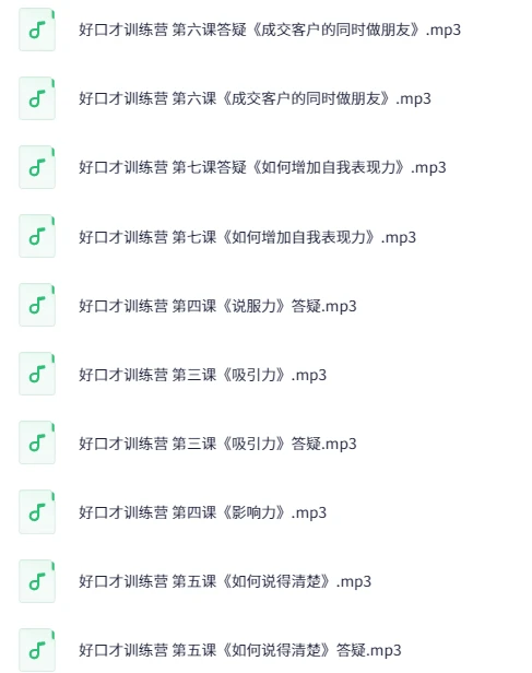 “萌姐好口才训练营”提供全周期口才提升课程,包含开营仪式、八大核心课程及结营总结。课程采用音频形式,每节课配备独立MP3文件,主题覆盖口才培养的完整知识体系。