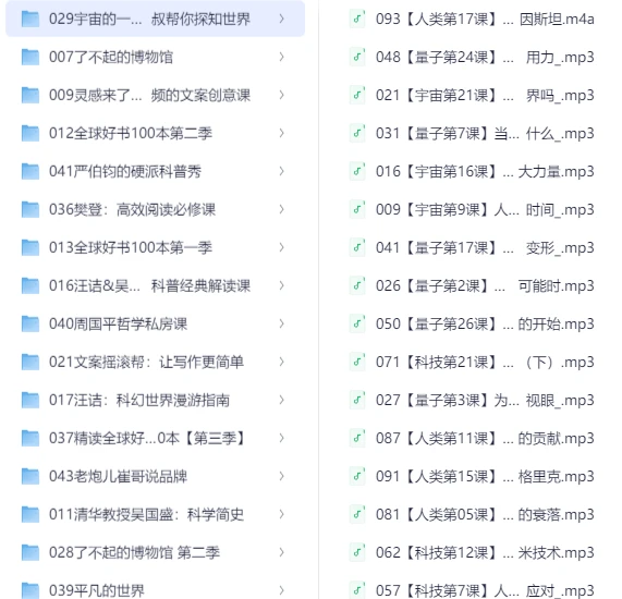 《喜马拉雅》付费音频—知识提升类合集,网盘资源,包含上千m3音频,涵盖全球好书、硬派科普、哲学课程、物理课程、节气讲解、改革开放史、宇宙探知、文案创意、科幻世界、人生解读、推理艺术、电影原著、科技聊、世界名著、品牌说、高效阅读、写作技巧、科学简史、天文知识、人文通识等多个领域,适合各类知识爱好者,助力个人成长。