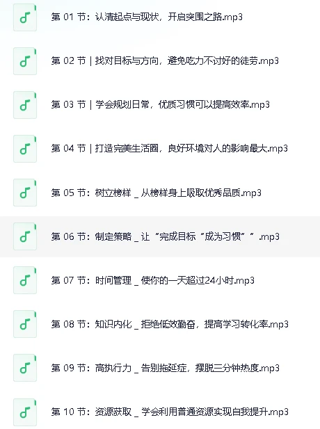 普通人必备的超实用逆袭法,轻松突破现状,实现人生跃迁(完结),夸克网盘课程。这套系统化成长课程完整覆盖个人突破的五大维度,从基础认知到高阶能力层层递进。课程开篇引导学员客观评估现状定位起点,通过目标拆解与路径规划建立清晰的成长坐标系。围绕效率提升展开习惯重塑训练,涵盖时间管理黄金法则、知识内化技巧以及高质量阅读方法论,重点破解低效勤奋的常见误区。